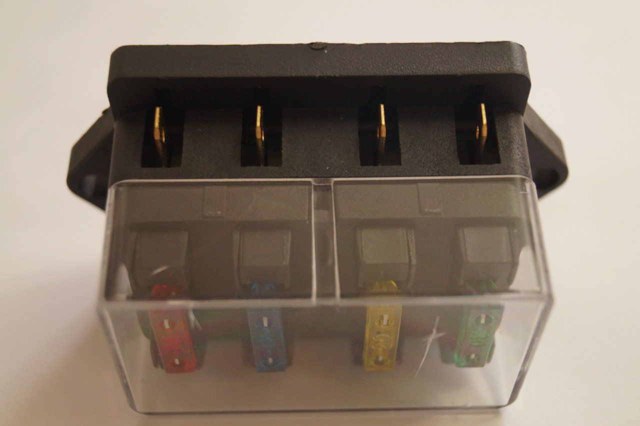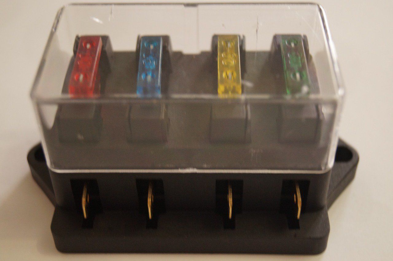 Boite a fusible pour automobile,camions bus et divers.dimensions hors tout 87X52X42mm.entraxe fixation par vis de 5 mm: 76 mm.bornes plate laiton 6mm.couvercle plastique.4 fusibles fournis de 10,15,20,30 Ampères.