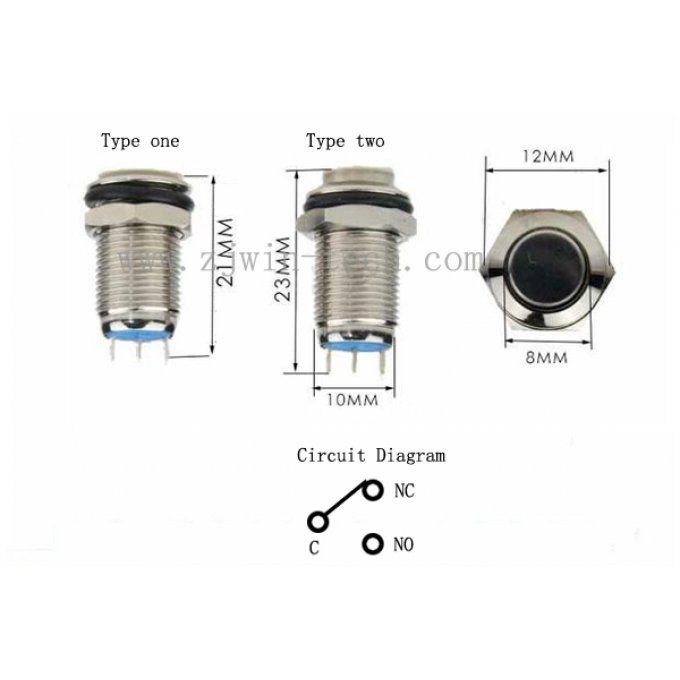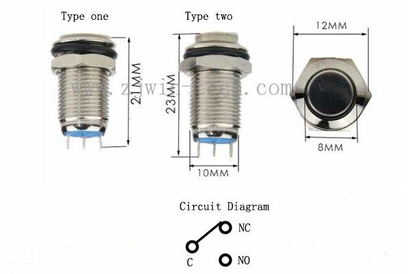 Diamètre de perçage 10 mm un contact NO/NF (inverseur) position maintenue par blocage mécanique. il faut appuyer pour obtenir un contact et appuyer une deuxième fois pour enlever ce contact.