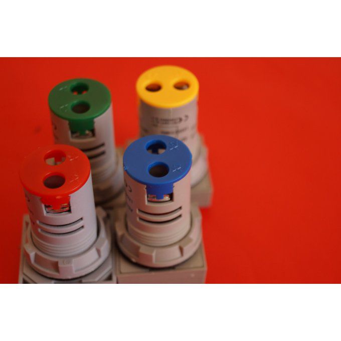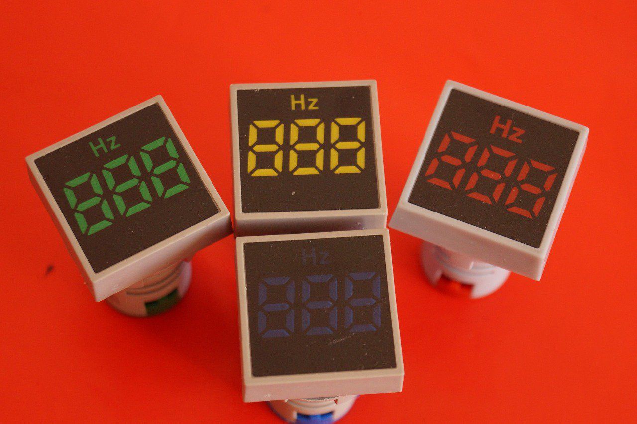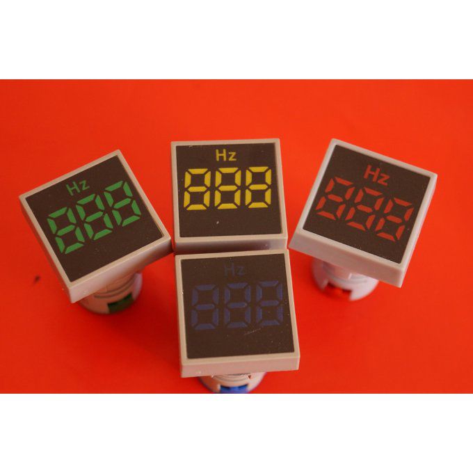 Fréquencemètre en 22 mm pour fixation.calibre 0/70 HZ joint torique pour étanchéité,grille de ventilation,bornes protégée pour les personnes.. 4 couleurs rouge,jaune,vert,bleu