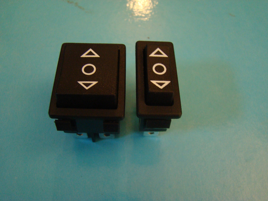 Momentané a trois positions.inverseur avec position centrale arrêt.type lève vitre bi ou monopolaire autres usages. deux modèles:encastrement.bi polaire 22X30 et monopolaire 11X30. 16Ampères 250 VAC ou 35 Ampères 12 VDC