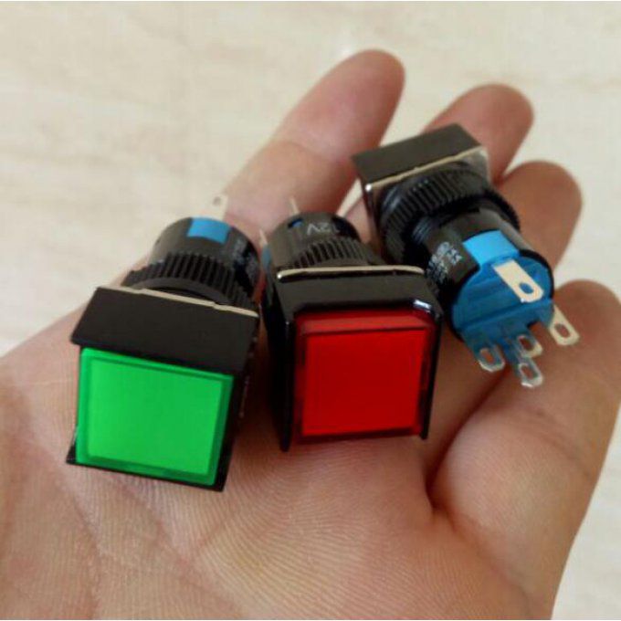 BOUTON POUSSOIR NO CARRE 14X14 perçage 11X11. autre modèle lumineux en 220 Volts Perçage et 14 mm carré de 17X17 mm 3 bornes de sortie en NO et NF