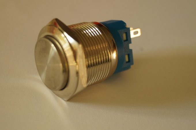 Bouton poussoir of (on) diamètre de perçage pour fixation 16 mm. 16mm 3A 250VAC métal inoxydable, bornes a souder ou montage sur petites cosses. plusieurs couleurs en stock.