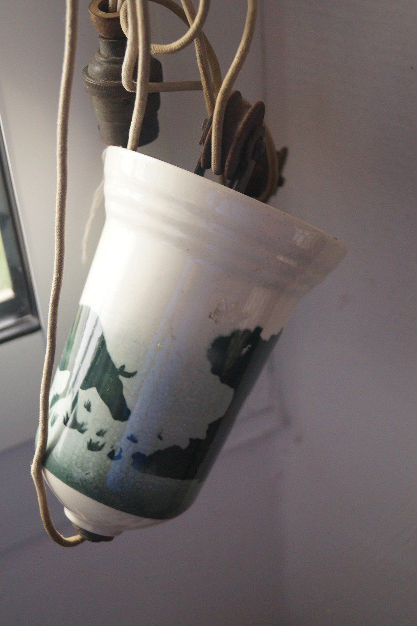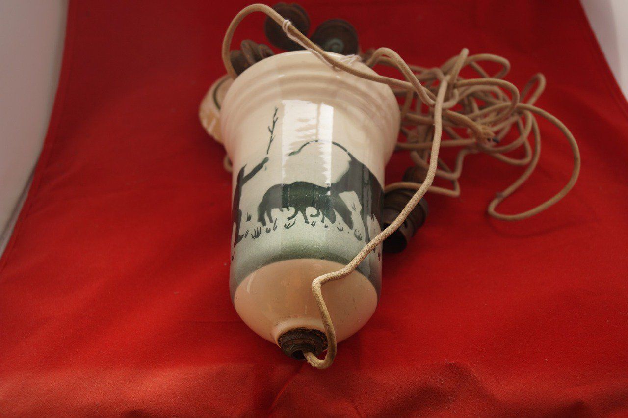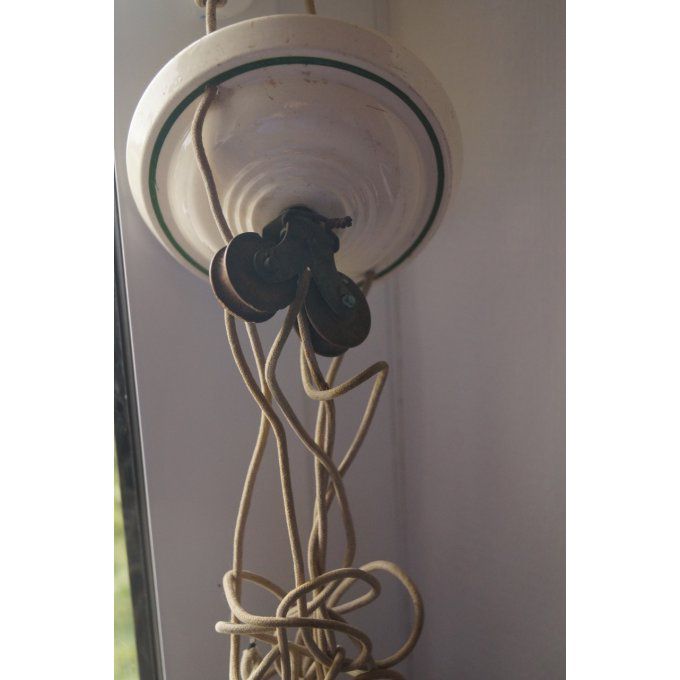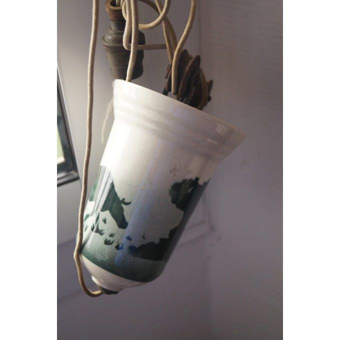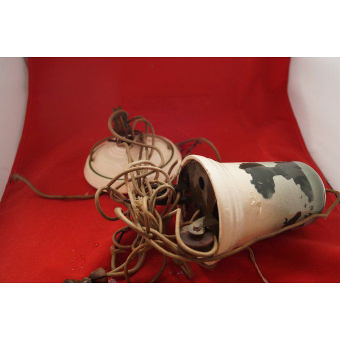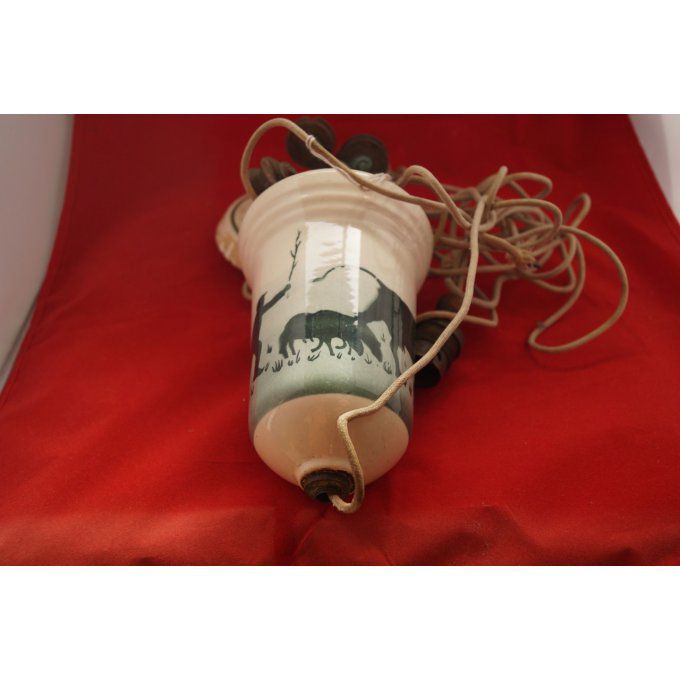 Monte baisse en céramique avec motif issu de la ruralité. complet avec poulie de plafond,câble,contrepoids et douille. la poulie du plafond s'accroche sur un crochet au plafond.voir les photos.