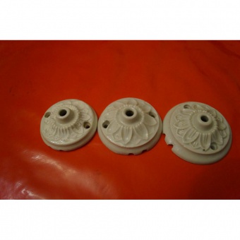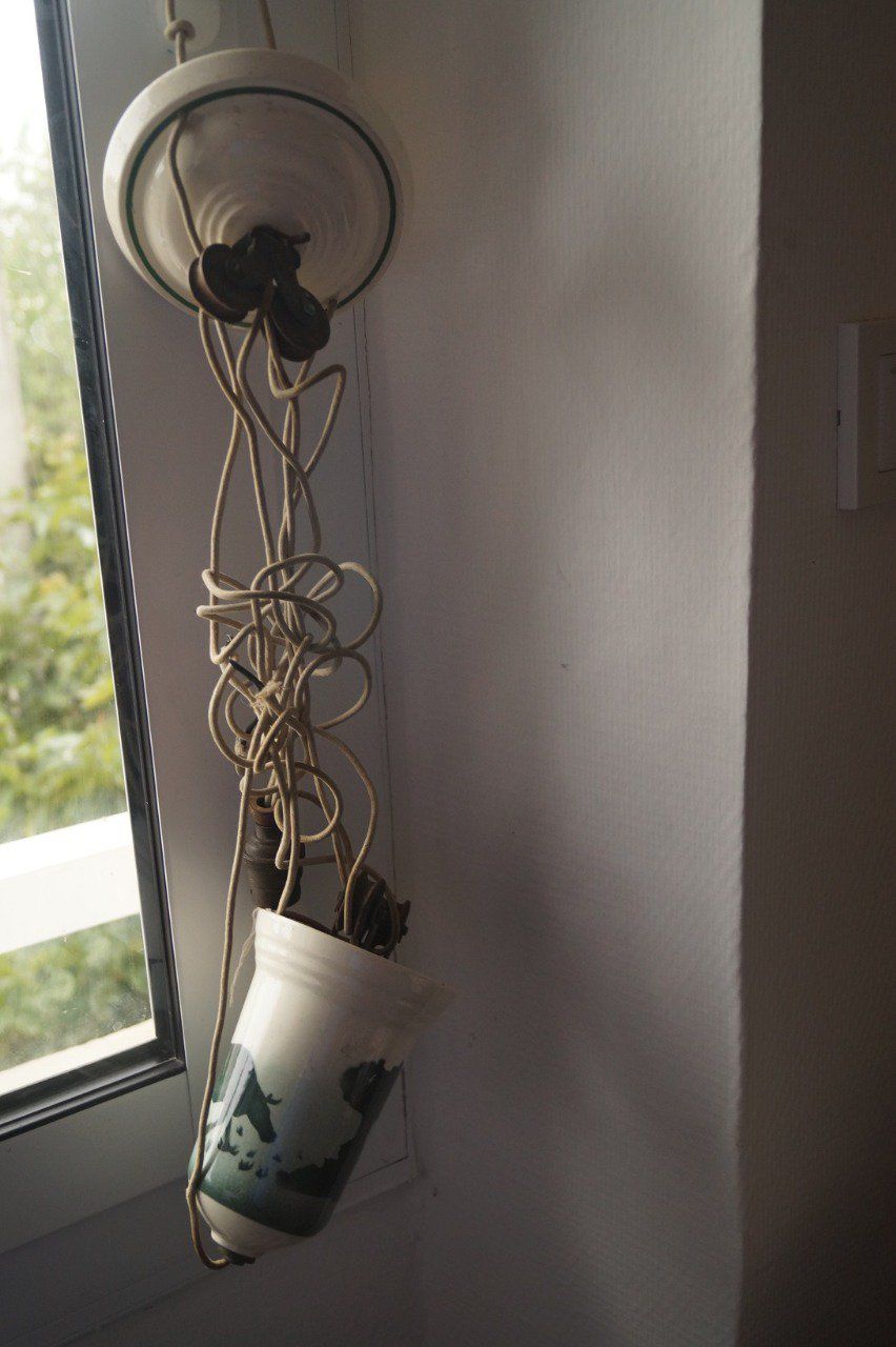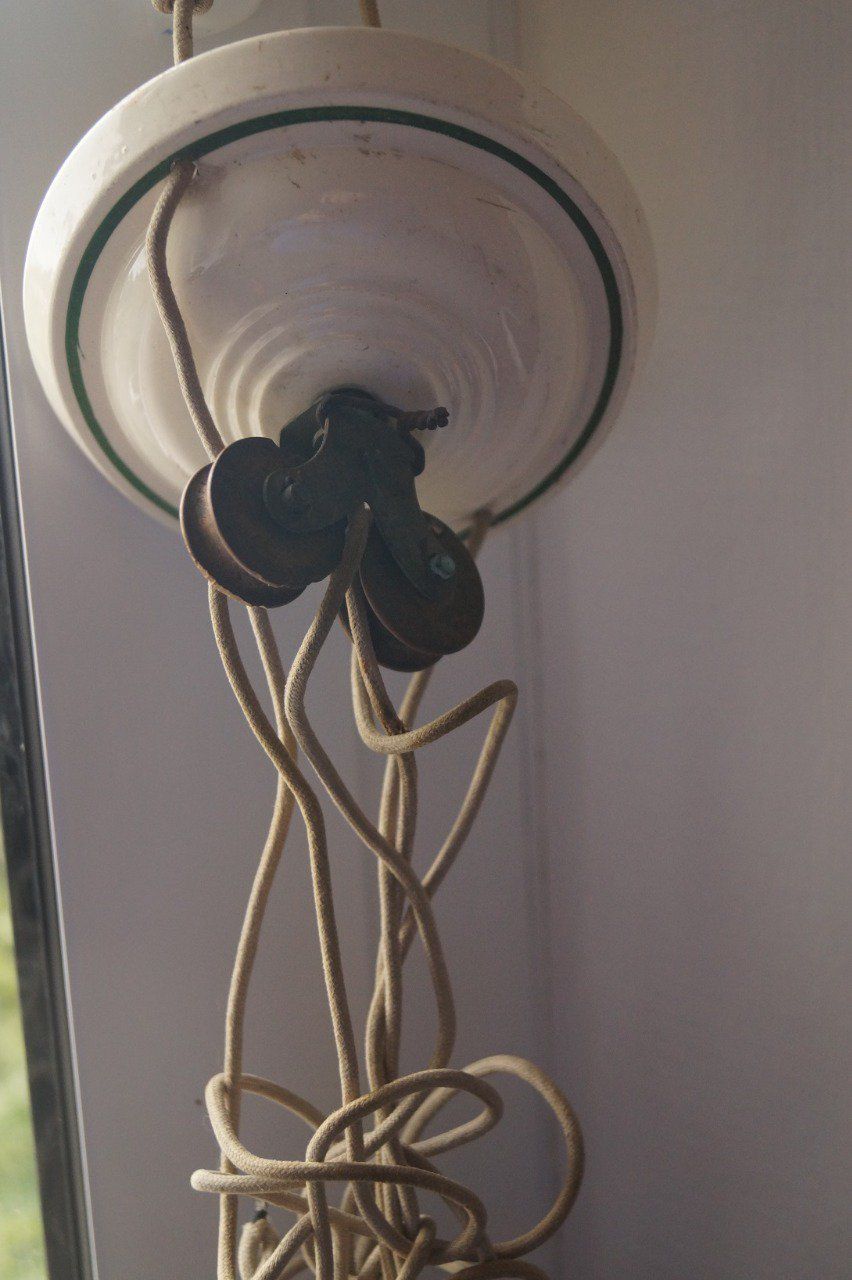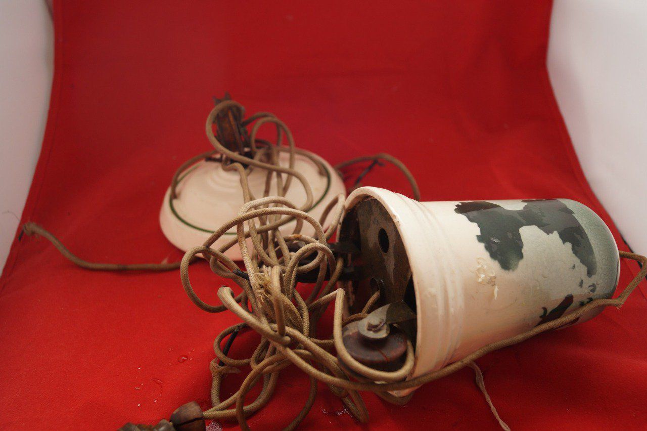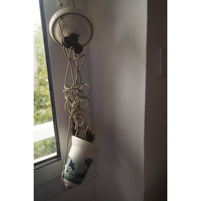 Monte baisse en céramique avec motif issu de la ruralité. complet avec poulie de plafond,câble,contrepoids et douille. la poulie du plafond s'accroche sur un crochet au plafond.voir les photos.