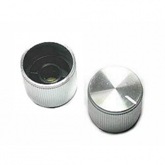Bouton de potentiomètre ou autre usage 6mm.plastique finition alu poli ,cranté sur le côté, diamètre 21mm.