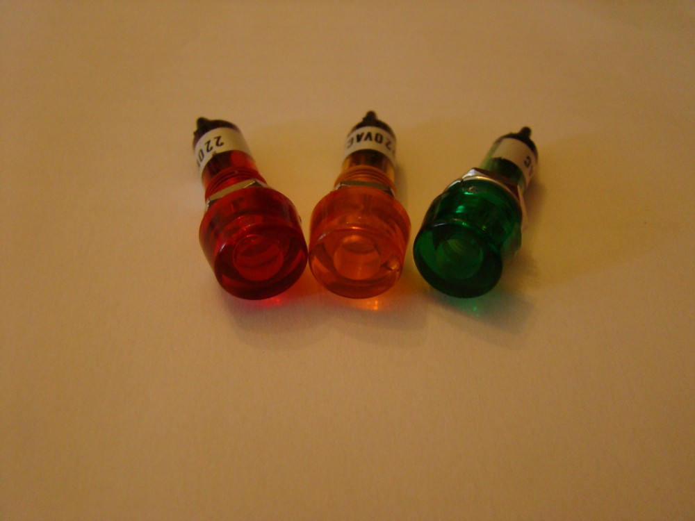 Voyants 220 VAC couleurs verte, orange, rouge. Tensions 12/24/220 Volts. Dimensions hors tout : 43X13 mm. Diamètre de perçage : 10 mm. Étanche par-dessus, matière plastique. Garantie 6 mois.
